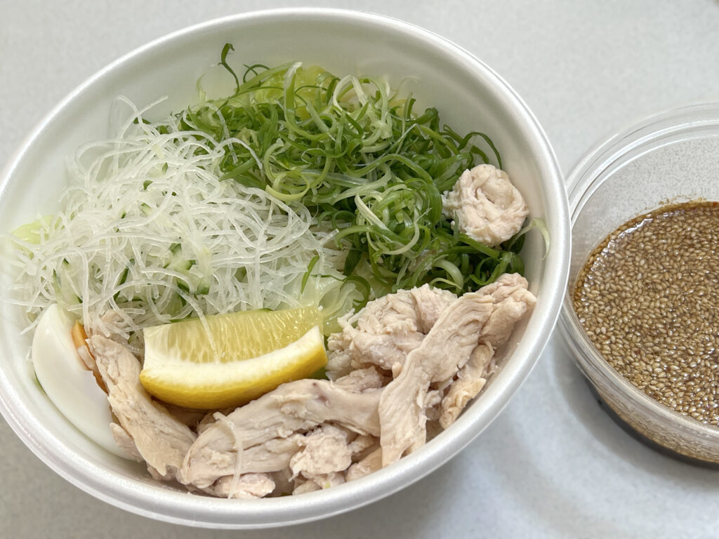 キンキンに冷やされた麺の上に、茹でキャベツなどの大量の野菜が山盛りとなっており、さっぱりとヘルシーにサラダ感覚でも食べられる冷たい麺料理です。