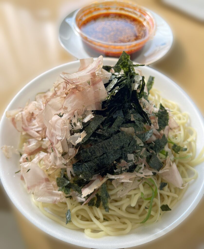この海苔や鰹節がつけだれに溶けることでつけだれの粘度があがって、麺がより多くのつけだれを絡めて持ち上げてくれるようになり、濃厚なかおりと辛さを楽しむことができるのです。