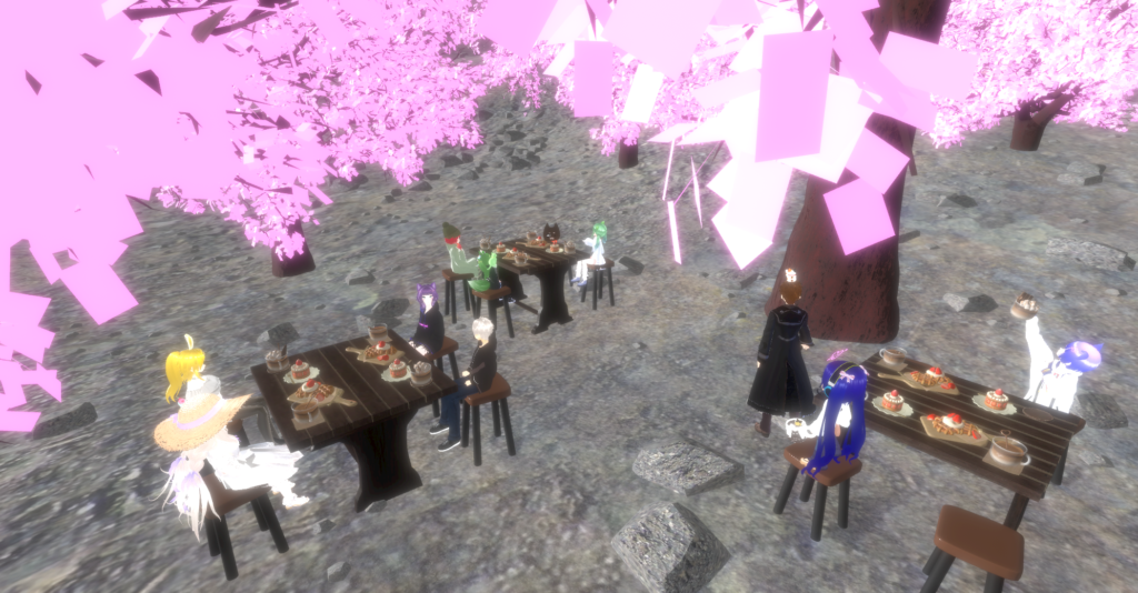 こちらのワールド、カフェの外に出ることもできて、そこには満開の桜の木の下でお茶会が楽しめます。