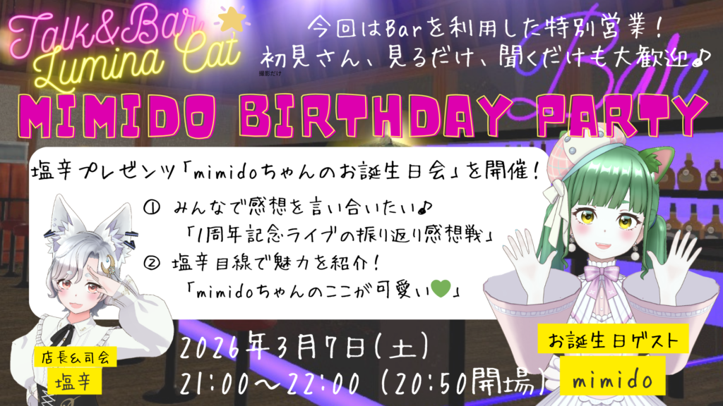 というわけで、3月7日 (土) 21:00- mimidoちゃんのBirthday Partyの開催が決定いたしました♡