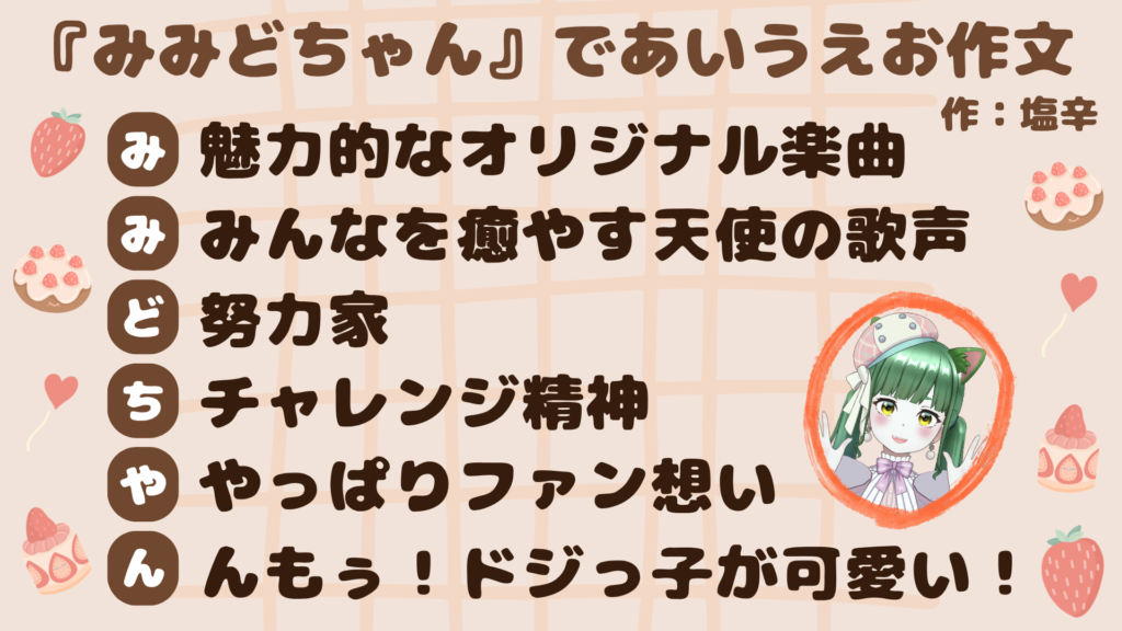 「あいうえお作文」を採用! mimidoちゃんの沢山の魅力から言葉を選ぶだけです🌟
