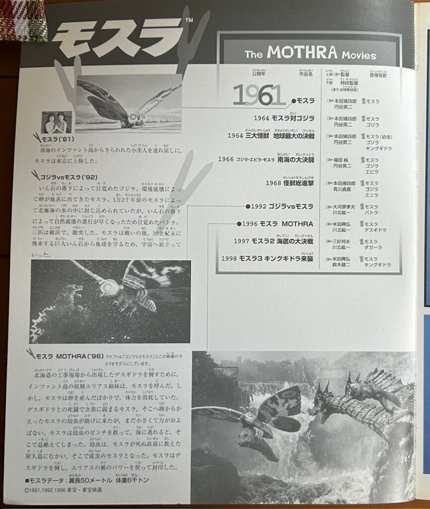 裏表紙に映画のパンフレットの画像がありました。これは1996年の「モスラ」ですね。