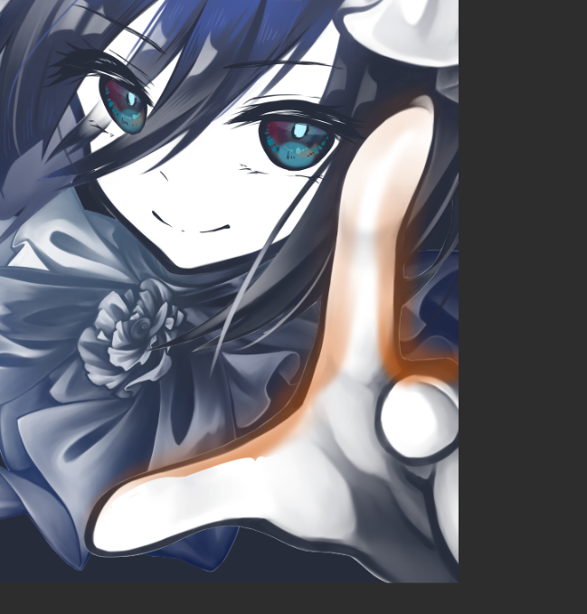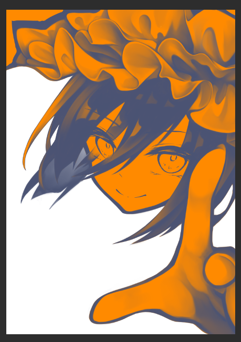 右側(頭の右上と手のあたり)にオレンジを入れました。手の影が薄くて白飛びしまくったのでかなり薄く入れてます。左下には濃いめに水色を入れてます。これは胸より下を描かなかったごまかしです()