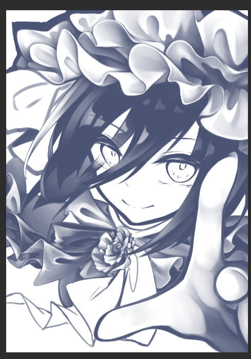 そしてまぁ…これが「多分」厚塗りの原因なんですけど、なぜか単色で描いてます。しかも白を使わず素材の味(白のところはキャンバスの色。透明色で抜いてます)で戦っている…しかもなんか妙に境界がはっきりしてますね???はい。何かがおかしいです。厚塗りなのかグリザイユ塗りなのか一周回って線画なのかわかりません。