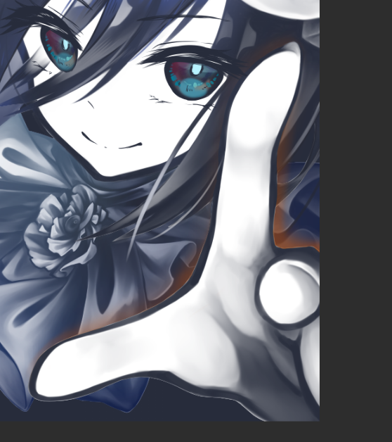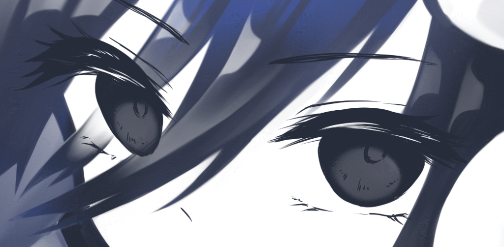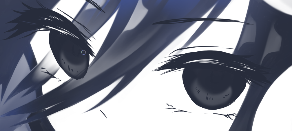 どっちがいいかな〜ってして下になりました。これは何をしたのかというと目の線画に(やっぱり線画してるじゃん)クリッピングで色を乗せる、いわゆる色トレです。まつげに赤を若干乗せて、上は白っぽい色、下は黒っぽい色をそれぞれ重ねました。薄い髪色だと白っぽいの乗せると髪の透けが表現できるのですが、今回は濃いめの髪色だったのと全体がほぼ一色でぼやぼやしがちだったのもあり、濃い方にしました。
