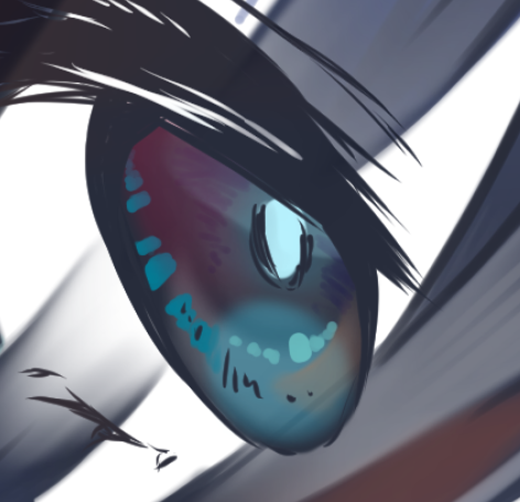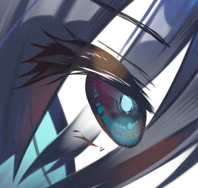 瞳孔の形を整え、目の淵をざかざかし、瞳孔周りに光っぽいものを入れました。まつげも、まつげの束を描いたりオレンジの光を入れたりしました。