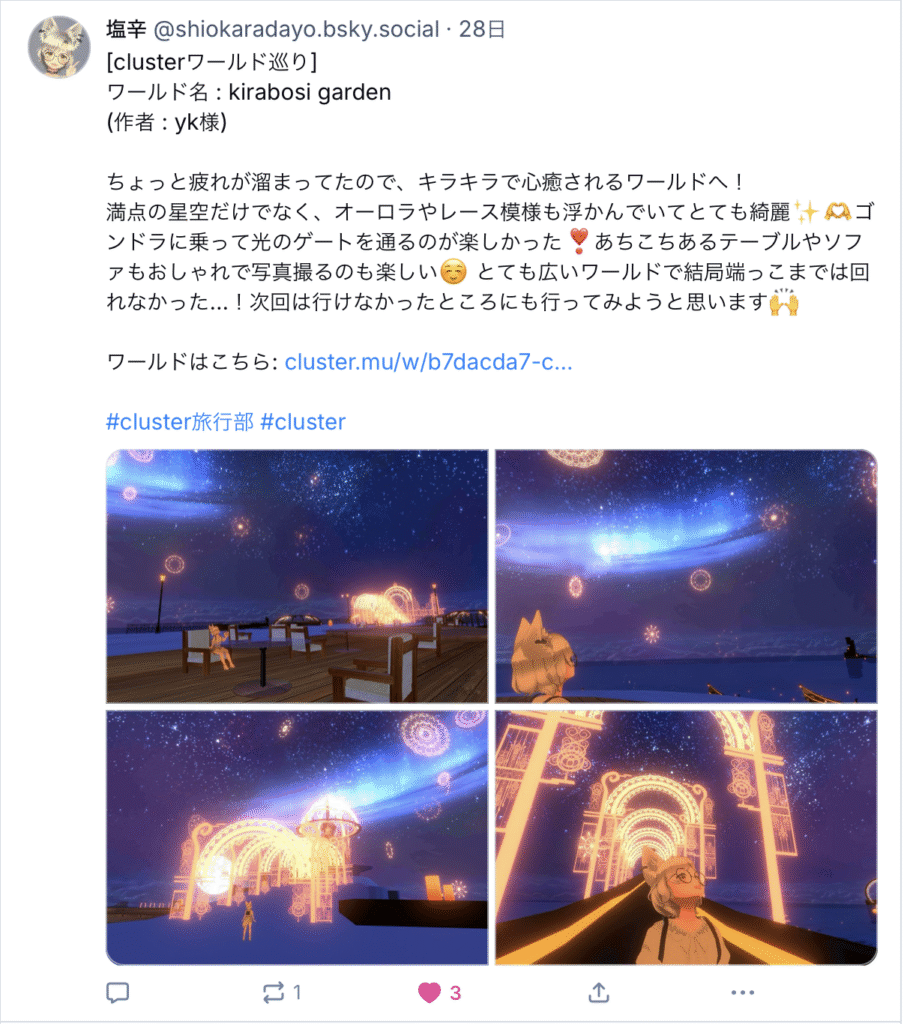 私も、clusterでの写真を投稿してみたり、自身のイベントのお知らせなどを最速で投稿したりしています˚✧₊⁎お気軽にご参加してみてください^^