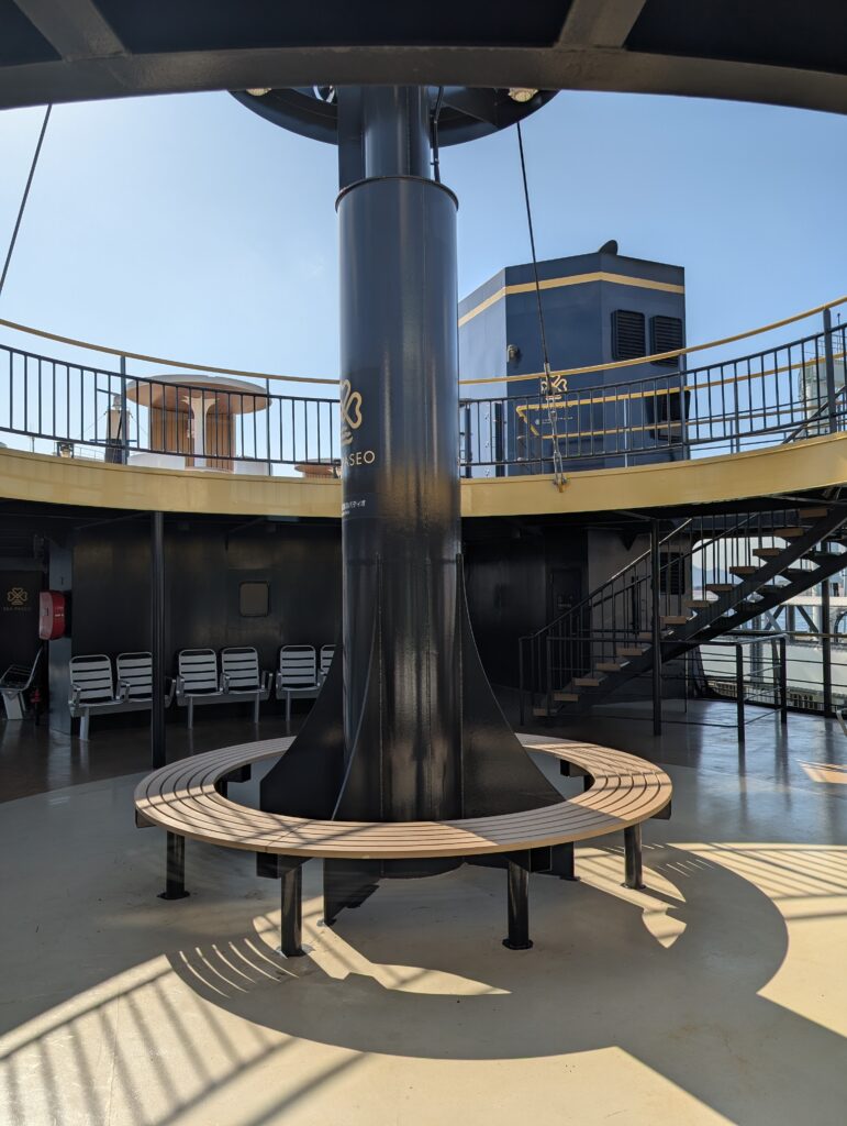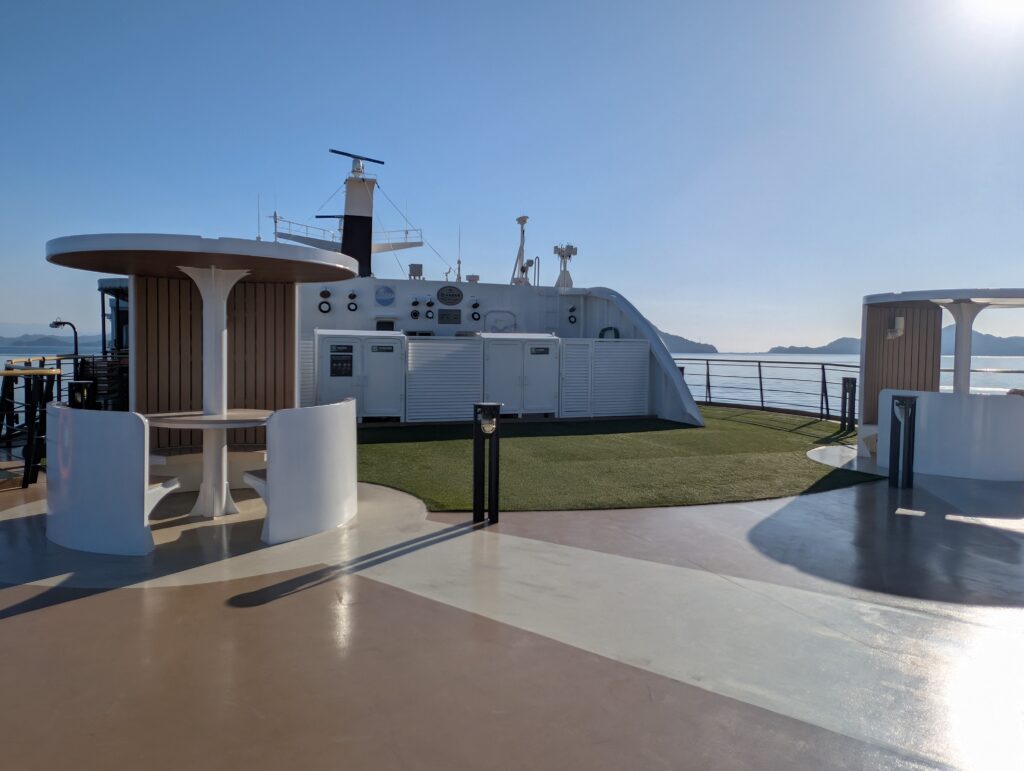 そら嬢は実は船があまり得意ではなくて、波にふわんふわんと揺れている感じが怖いのですが(特に停泊中…)、席に座っていて揺れを感じたときはよくこのデッキに上がってきます。