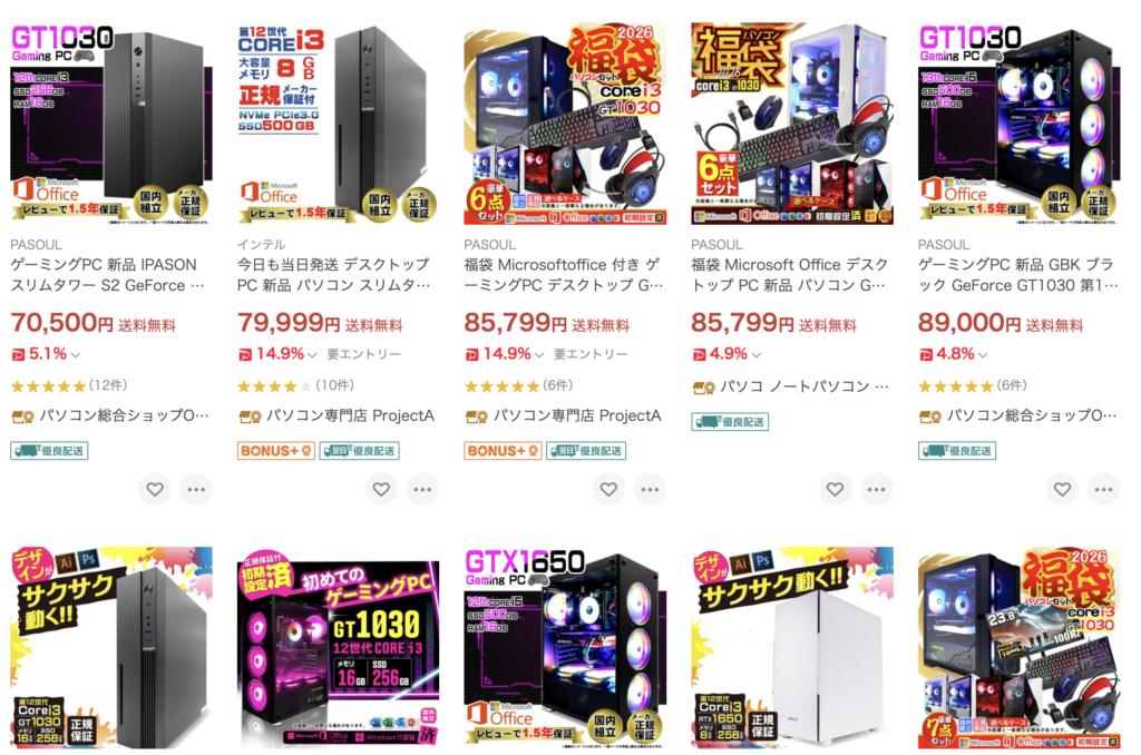 ちなみに、私は楽天は使わないのですが試しに検索してみたところ、検索キーワードと全然ちがうスペックの激安PC(超怪しい)がヒットするほかは、普通の価格のゲーミングPCが目につくだけでした。