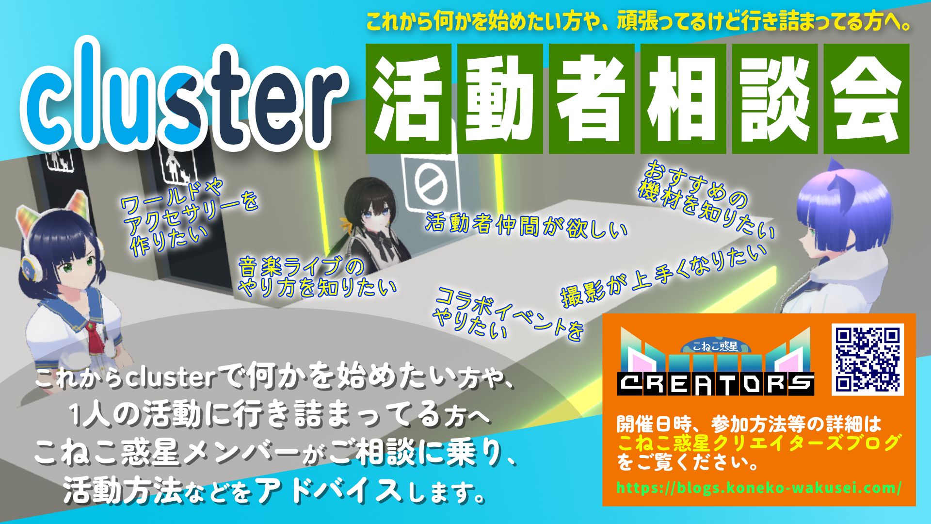 これからclusterで何かを始めたい方や、一人で頑張っているけど行き詰まっている方などの疑問やお悩み解決の場になればと思い、こねこ惑星クリエイターズの有志が開催する相談会です。