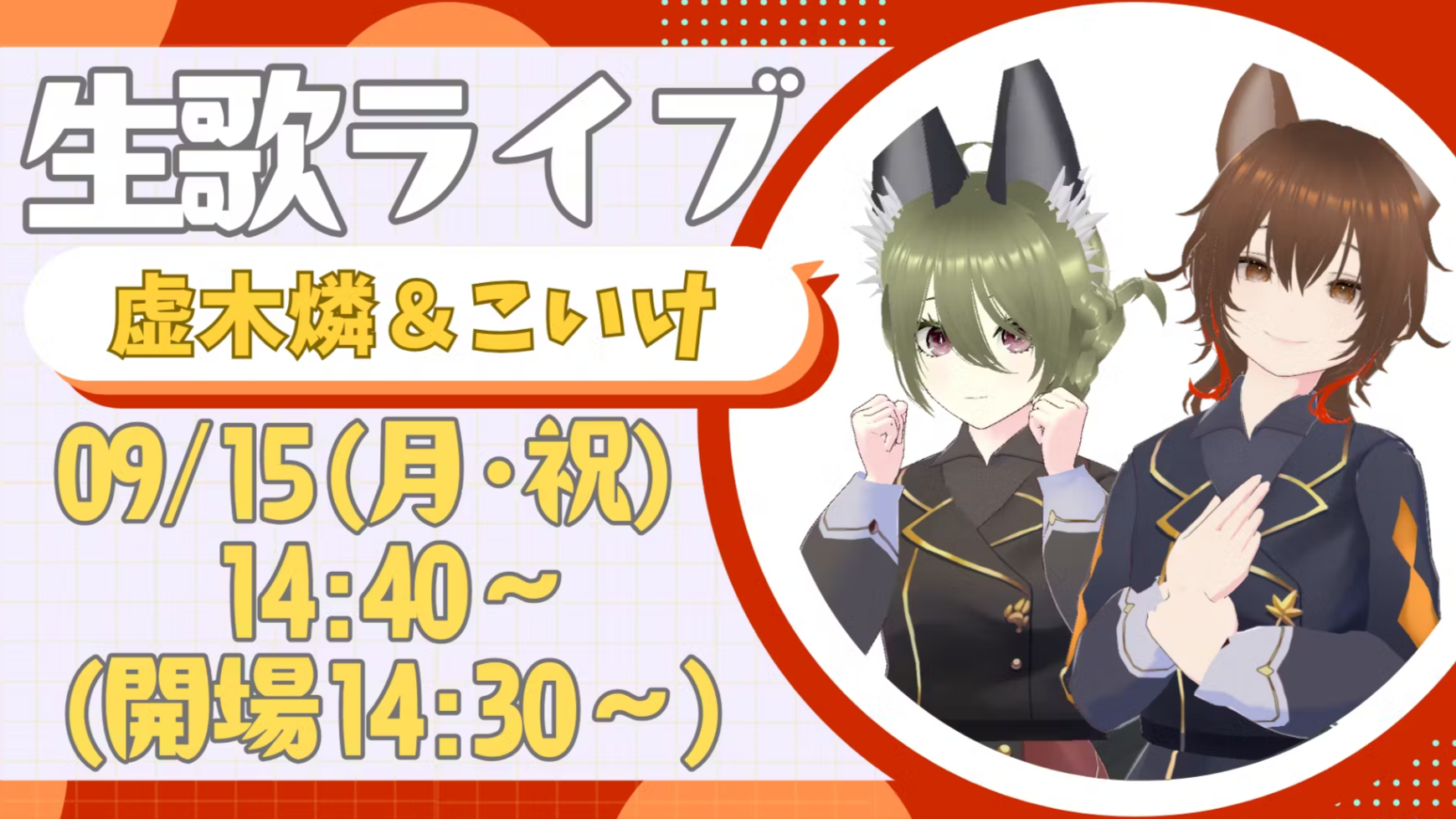 虚木燐さんとこいけのコラボミニライブです! 3曲ずつ、計6曲を予定しています。 途中入室・退室OKですので、おやつどきのお伴としてお気軽にお立ち寄りください⭐