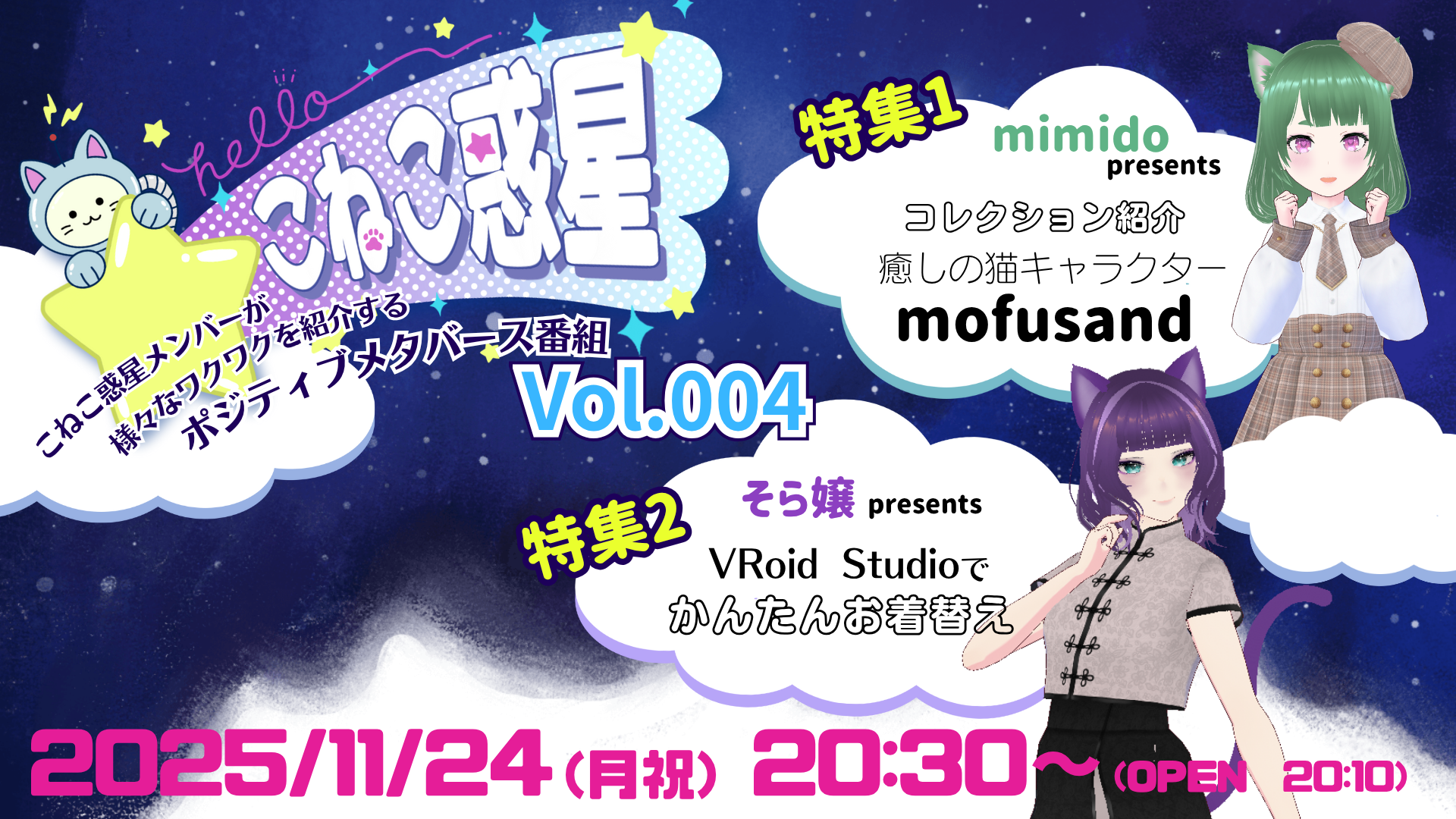 こねこ惑星がお送りするポジティブメタバース番組! メンバーそれぞれの好きなことや気になることをジャンルレスで紹介します。 🌟出演者🌟 mimido▶プロフィール そら嬢▶プロフィール 瑠璃星こねこ(アシスタント)▶プロフィール ※出演者や内容は変更となる場合もあります。 🌟特集1🌟コレクション紹介 癒しの猫キャラクターmofusand イラストレーターぢゅのさんによる猫キャラクター「mofusand(モフサンド)」、大人気ゆえに各地に専門店もあり、いろいろなグッズが販売されています。 そんな「mofusand沼」にはまったmimidoがmofusandとは何かをご紹介し、私物のコレクションをお見せします。 🌟特集2🌟VRoid Studioでかんたんお着替 […]