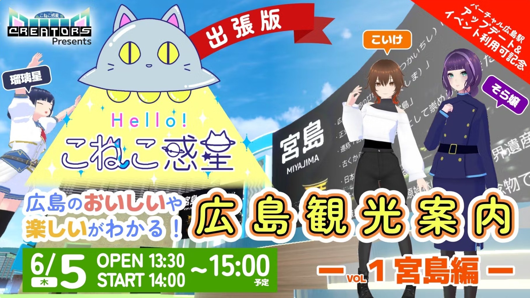 clusterこねこ惑星クリエイターズのネット番組が始動! その名も『ハローこねこ惑星』🌟 今回、いきなりの出張版です! clusterの「バーチャル広島駅」ワールドのイベント利用開始を記念して 広島の観光案内イベントを開催します🎶 第一回のテーマは広島が誇る観光名所・宮島! 観光スポット、グルメ、お土産など、おすすめ情報がたっぷり詰まった1時間。 clusterにて公開収録イベントのほか、YouTubeでの配信、アーカイブも予定しています。 ぜひ遊びに来てくださいね✨ 【イベント詳細】 https://cluster.mu/e/0a2a614c-4d8c-4957-81ab-1e2b8b2160b1 【キャスト・スタッフ】 主催・配信:瑠璃星こねこ(バーチャル広島駅応援団) メイン […]