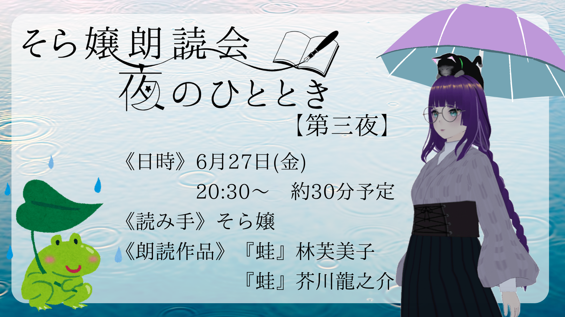 cluster本が好きなそら嬢が、青空文庫より文学作品の朗読をいたします。 コメント無し、作業のお供にラジオ感覚でのご利用もOKです。 週末の夜、文学作品に耳を傾けながらゆったりとした時間をお過ごしください。 🔽詳細はこちら🔽 https://cluster.mu/e/ac8ca7e4-244e-4598-a4cc-135f66bc71b3 .
