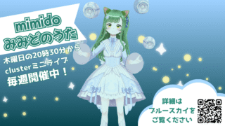 mimido clusterライブ『みみどのうた』 毎週木曜日、clusterにて定例ライブ開催中! 優しい歌声に包まれて、心地良い時間を過ごしませんか? 🔽詳細情報はblueskyにて更新します🔽 2025.11.03