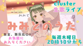 mimido clusterライブ『みみどのうた』 毎週木曜日、clusterにて定例ライブ開催中! 優しい歌声に包まれて、心地良い時間を過ごしませんか? 🔽詳細情報はblueskyにて更新します🔽 2025.10.08